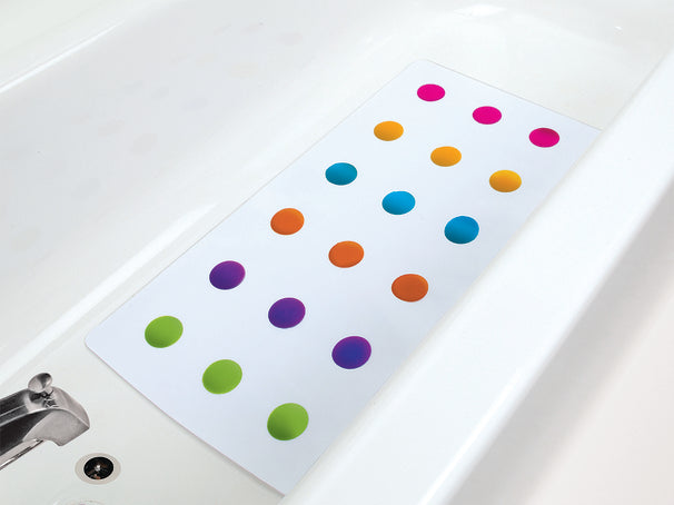 Supersnygg badmatta med roliga prickar i glada färger. Sugproppar ger mattan bra fäste men gör den också enkel att ta bort om så önskas.