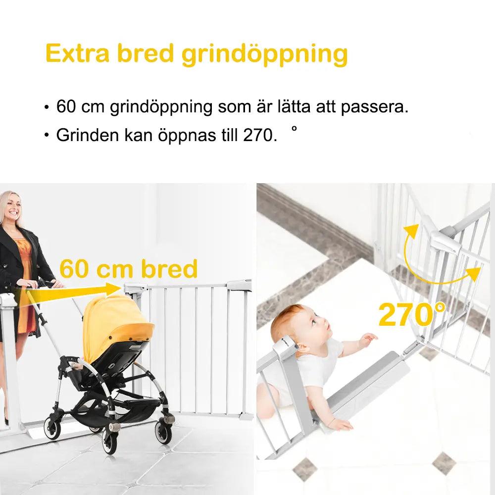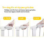 - Den har tre-stegs lås som gör det omöjligt för små barn att kunna öppna grinden. Vuxna kan däremot öppna enkelt med en hand.