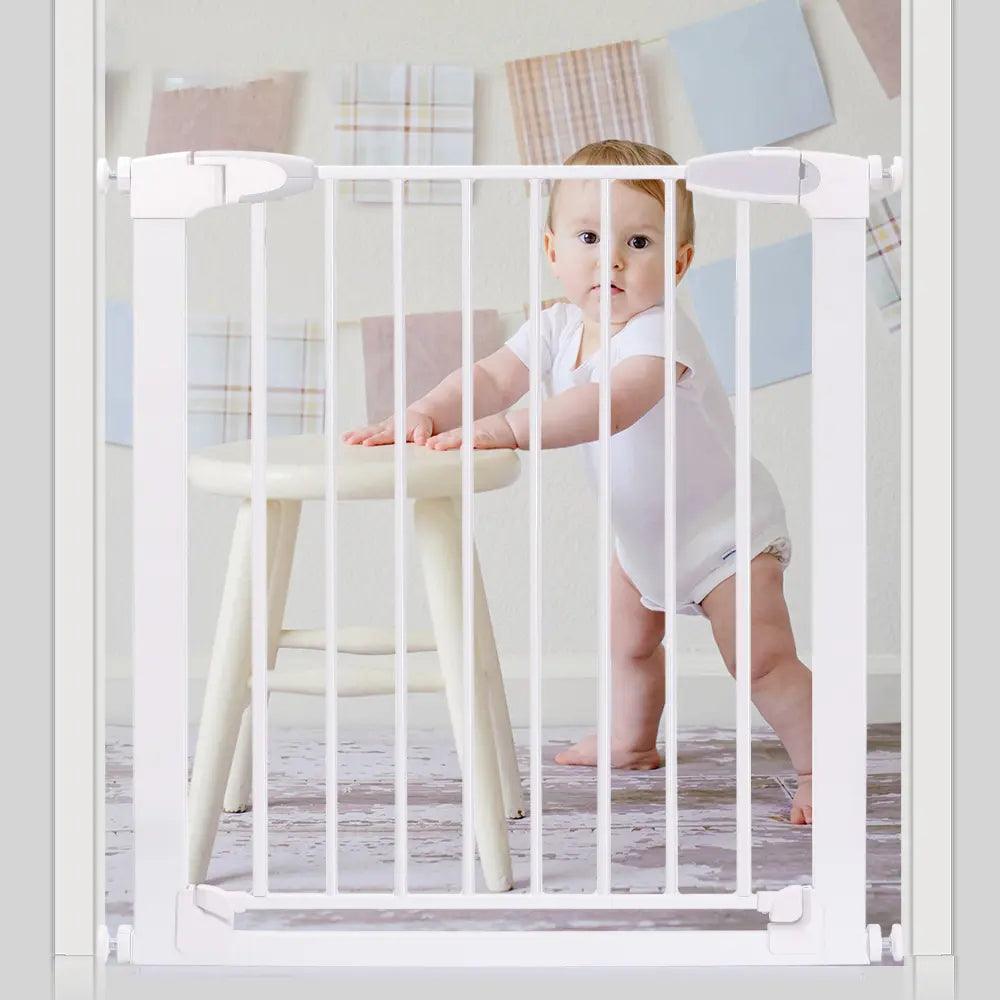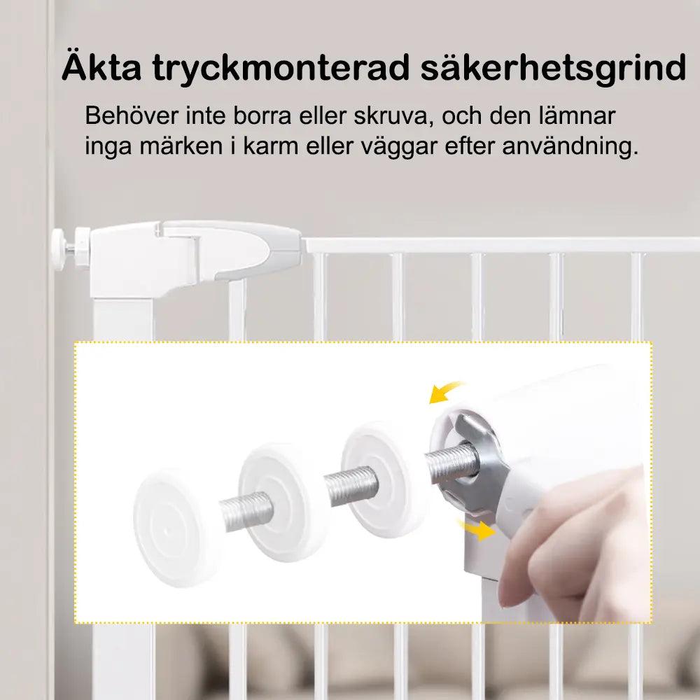 - Den är en äkta tryckmonterad säkerhetsgrind, så att ni inte behöver borra eller skruva, och den lämnar inga märken i karm eller väggar efter användning.