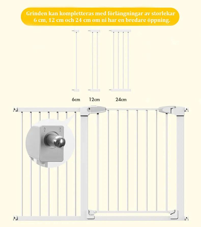 Passar öppningar mellan 76-83 cm, kan förlängas till max 122 cm med förlängningar. - Den kan kompletteras med förlängningar av storlekar 6 cm, 12 cm och 24 cm om ni har en bredare öppning. Förlängningarna säljs separat.